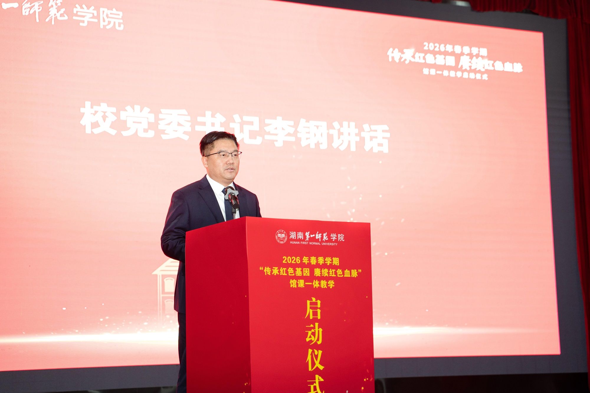 启动仪式上,全体师生共同观看了习近平总书记考察学校的新闻视频,重温习近平总书记殷切嘱托。李钢在讲话中指出,我校素有“千年学府、百年师范”的美誉,是开展爱国主义教育、传承红色基因的好地方。开展馆课一体教学,既是深入贯彻落实习近平总书记嘱托的政治答卷,也是落实立德树人根本任务的创新路径。他强调,学校将用好红色资源,坚守师范主责主业,从课程体系、教学方法、师资队伍三个维度系统发力,持续打造“第一师范”大思政品牌,推动馆课一体教学走深走实,引导师生在历史现场感悟信仰力量、涵养家国情怀,切实担负起为党育人、为国育才的光荣使命。